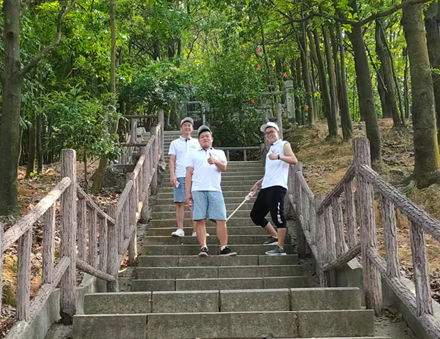 山路前半段稍緩和,大家還能大隊(duì)結(jié)伴而行,甚至走在隊(duì)伍最前方的帶隊(duì)同事還能高舉旗幟快速奔跑,但在行進(jìn)至快半山腰后,坡度陡峭的石階路開始出現(xiàn),上山路途難度加大,隊(duì)伍逐漸形成了梯隊(duì)。體力好、耐力強(qiáng)的同事依然穩(wěn)步快速向上,體力稍遜的同事雖然與前面的同志拉開了距離,但也絲毫不甘落后,勇往直前,奮起直追。盡管山路漸陡、腳步變得沉重,呼吸變得急促,但是,大家互相關(guān)照,相互勉勵(lì),共同堅(jiān)持,最終成功登頂。